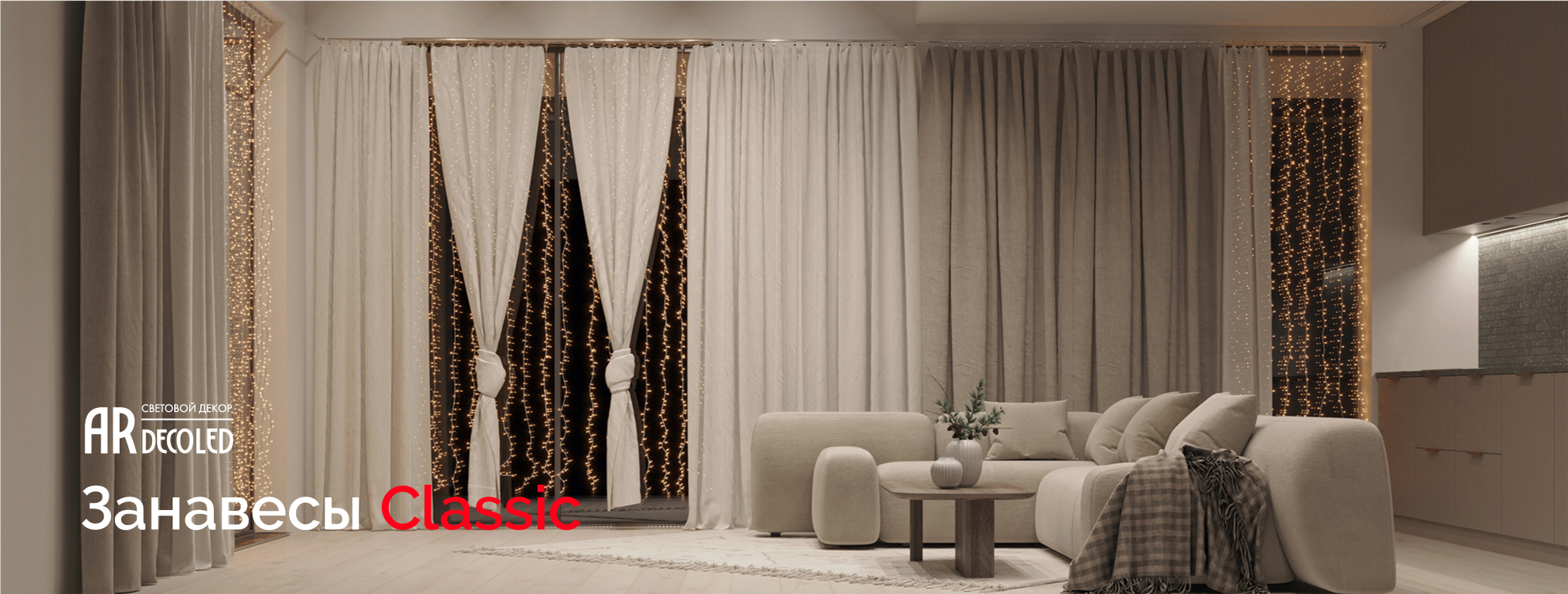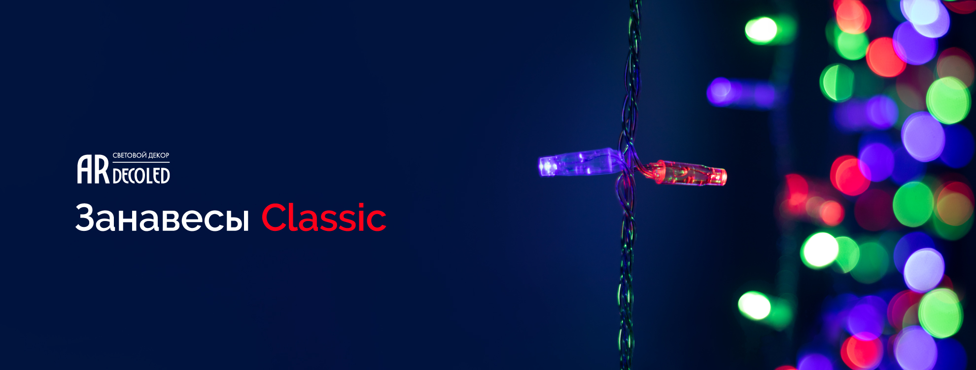 Гирлянды «Занавес» серии CLASSIC представляют собой ниспадающие нити равной длины на одном кабеле. Гирлянды данной серии можно использовать для оформления интерьеров, а также фасадов и веранд под навесом.
