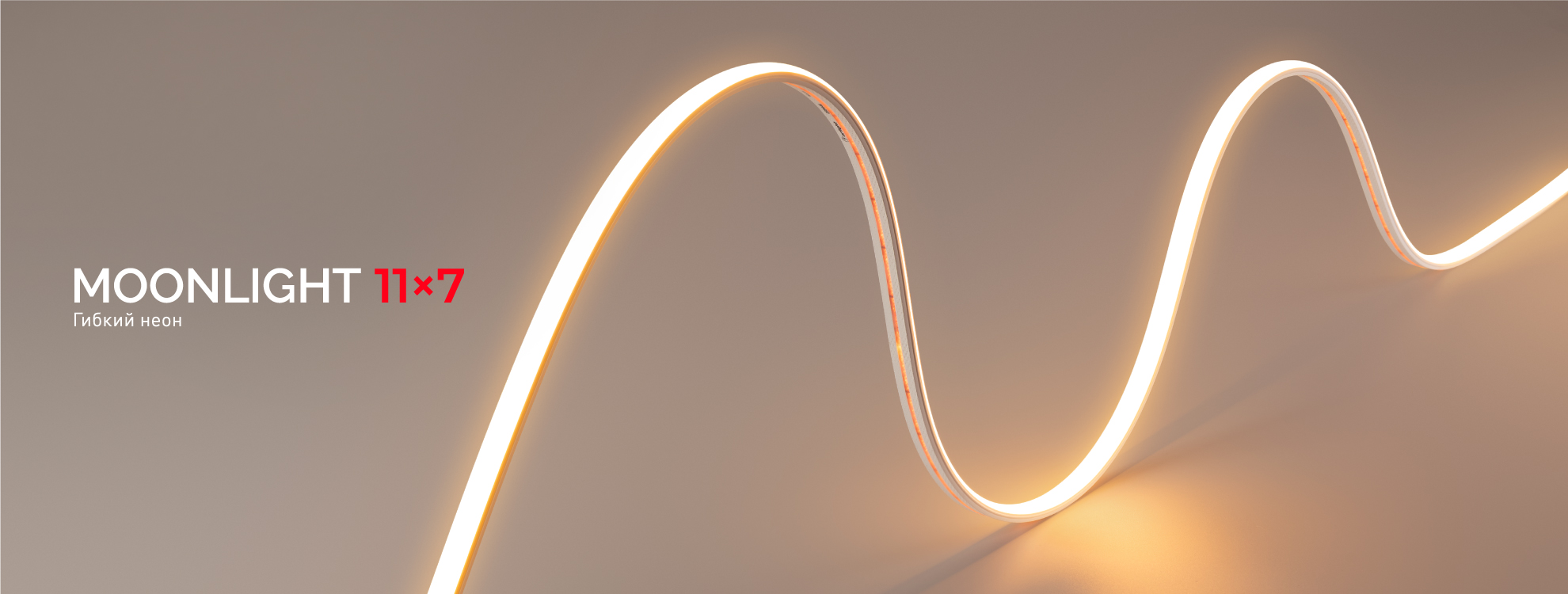 Гибкий неон MOONLIGHT с куполообразным сечением 11×7 мм — отличное решение для создания дополнительного освещения и подсветки мебели, в том числе и во влажных помещениях.