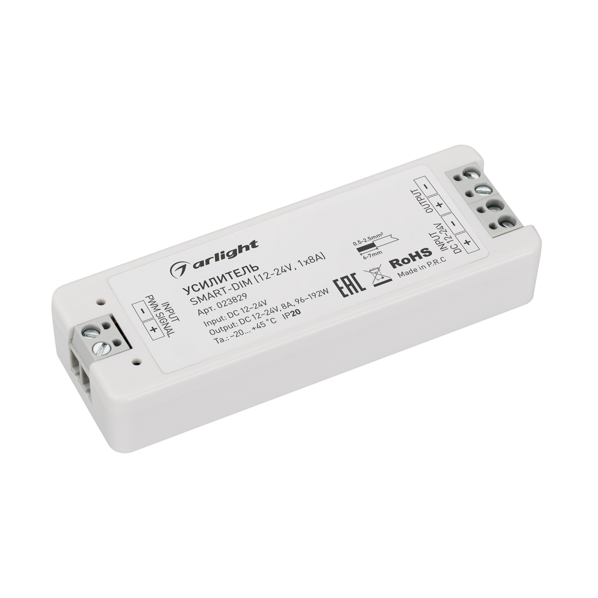 1-канальный усилитель, предназначенный для увеличения мощности и подключения большего количества одноцветных светодиодных лент. Питание изделия имеет диапазон напряжений от 12В до 24В, максимальный ток 8А на 1 канал, максимальная мощность 96-192Вт (в зависимости от напряжения питания). Усилитель имеет пластиковый корпус белого цвета. Габариты изделия составляют 97x33x18 мм.
