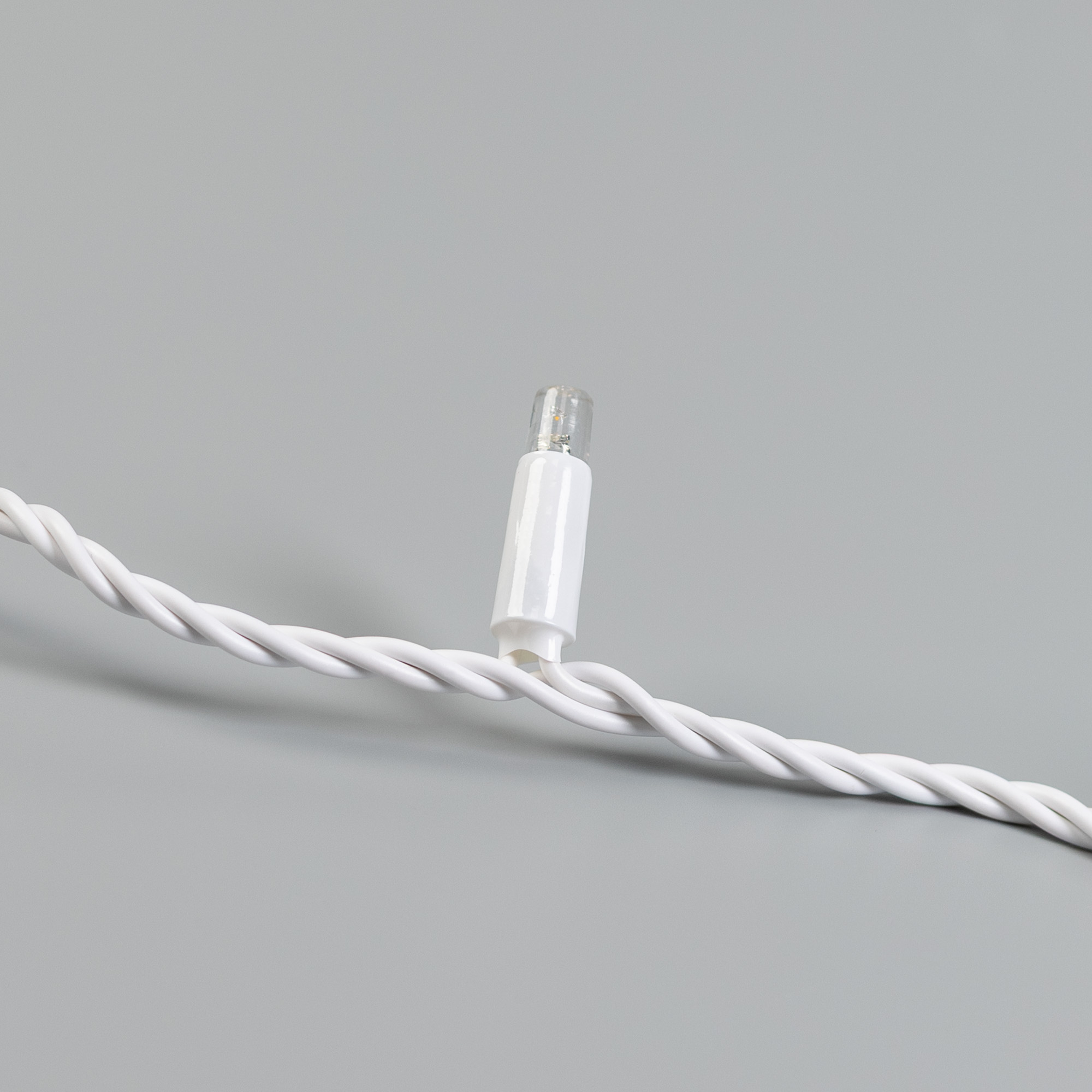 Светодиодная нить Classic. Размер 10000 мм. Цвет свечения ТЕПЛЫЙ БЕЛЫЙ (3000 К). 100 светодиодов размером 7 мм со статическим эффектом свечения с резким световым рисунком (прозрачная вогнутая линза). Провод белый, ПВХ. Питание 230 В, Мощность 7 Вт, защита IP65, применение в помещении и на улице под навесом. Аксессуар для подключения приобретается отдельно.