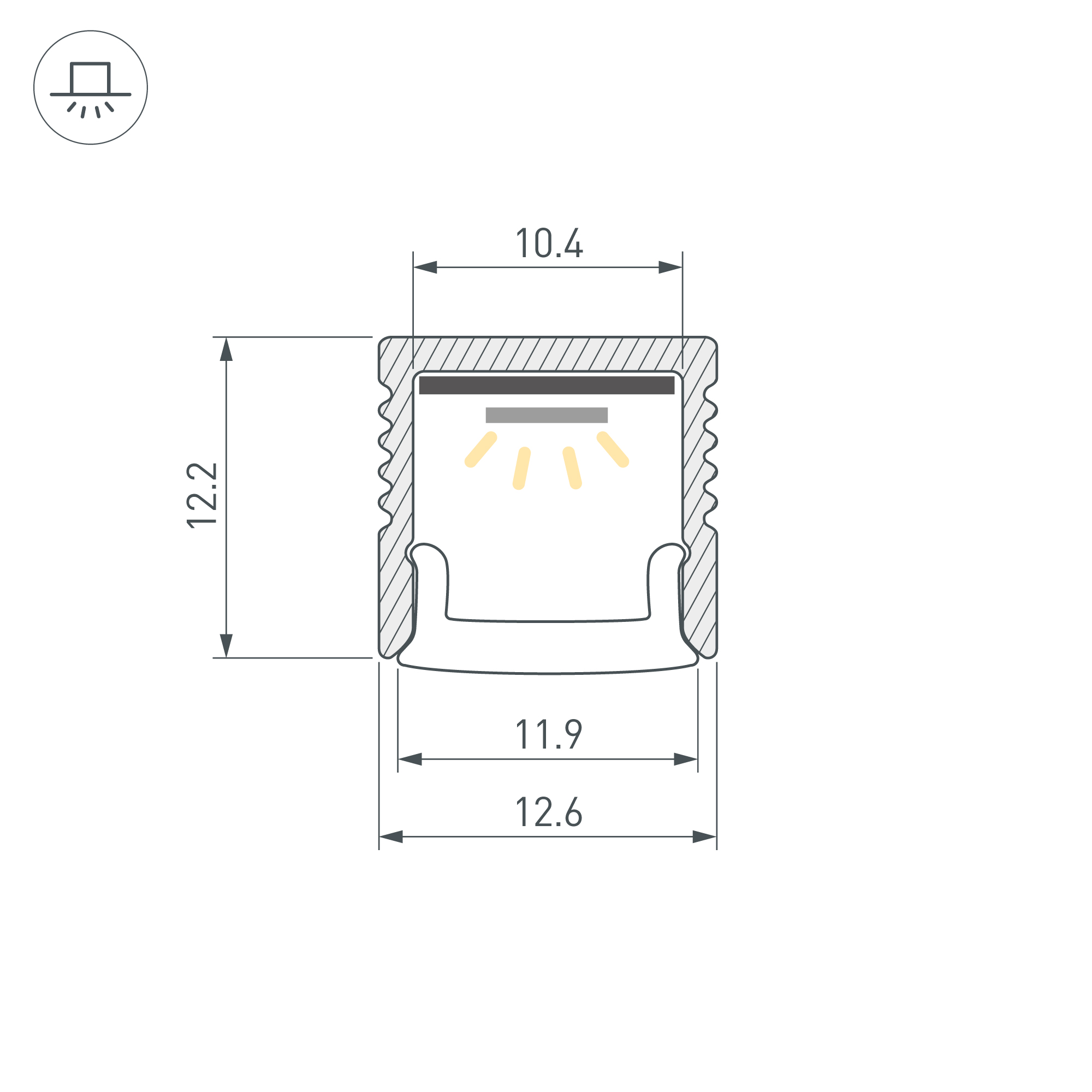 Габаритные размеры профиля составляют 2000 мм в длину, 12,7 мм в ширину и 12 мм в высоту. Площадка для установки светодиодных лент позволяет использовать ленту шириной до 10 мм и мощностью до 12 Вт/м. Рекомендуется использовать с гибкой светодиодной лентой серии RZ.