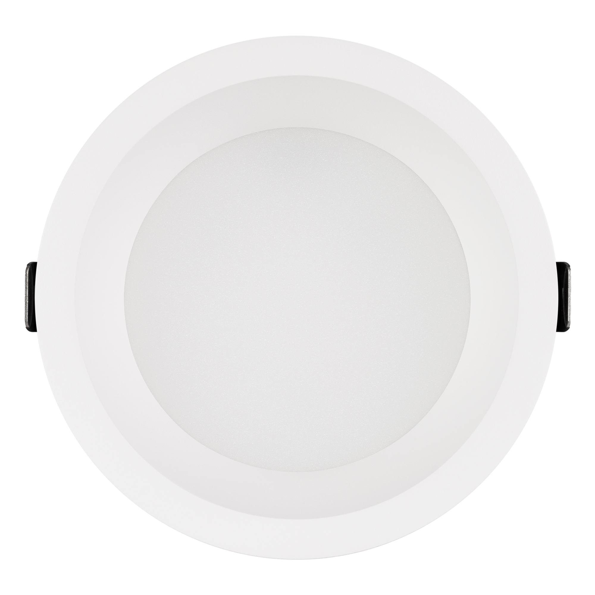 Встраиваемый светильник даунлайт. Мощность 30 Вт, св. поток 2845 лм, 95 лм/Вт, тёплый 3000 K, CRI>90, угол 90°, напряжение питания 230 В. Белый круглый корпус из алюминия, степень защиты IP54. Размер: диаметр 158 мм, высота 72 мм. Монтаж встраиваемый, установочное отверстие: диаметр 145 мм. Драйвер IP54, 27-43 В, 800 мА, пульсация <2%.