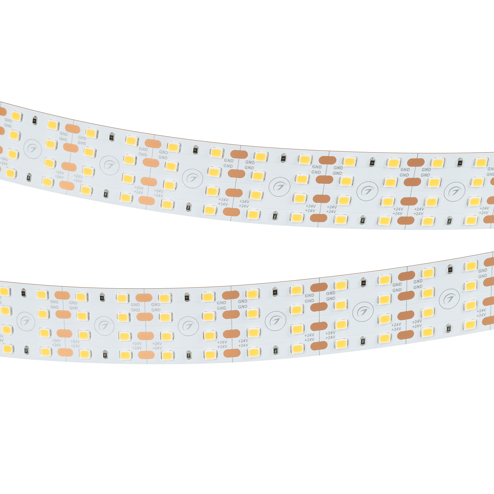 Светодиодная широкая лента UL серии A320. Светодиоды SMD 2835, 320 шт/м, белая плата шириной 24 мм, скотч 3M. Цвет ТЕПЛЫЙ 3000K, индекс цветопередачи CRI>90, угол 120°. Питание 24 В, мощность 26 Вт/м (65 Вт на 2.5 м). Размеры 2500x24x1.5 мм. Мин. отрезок 25 мм, 8 светодиодов. Цена за 1 м. Обязательна установка на профиль.