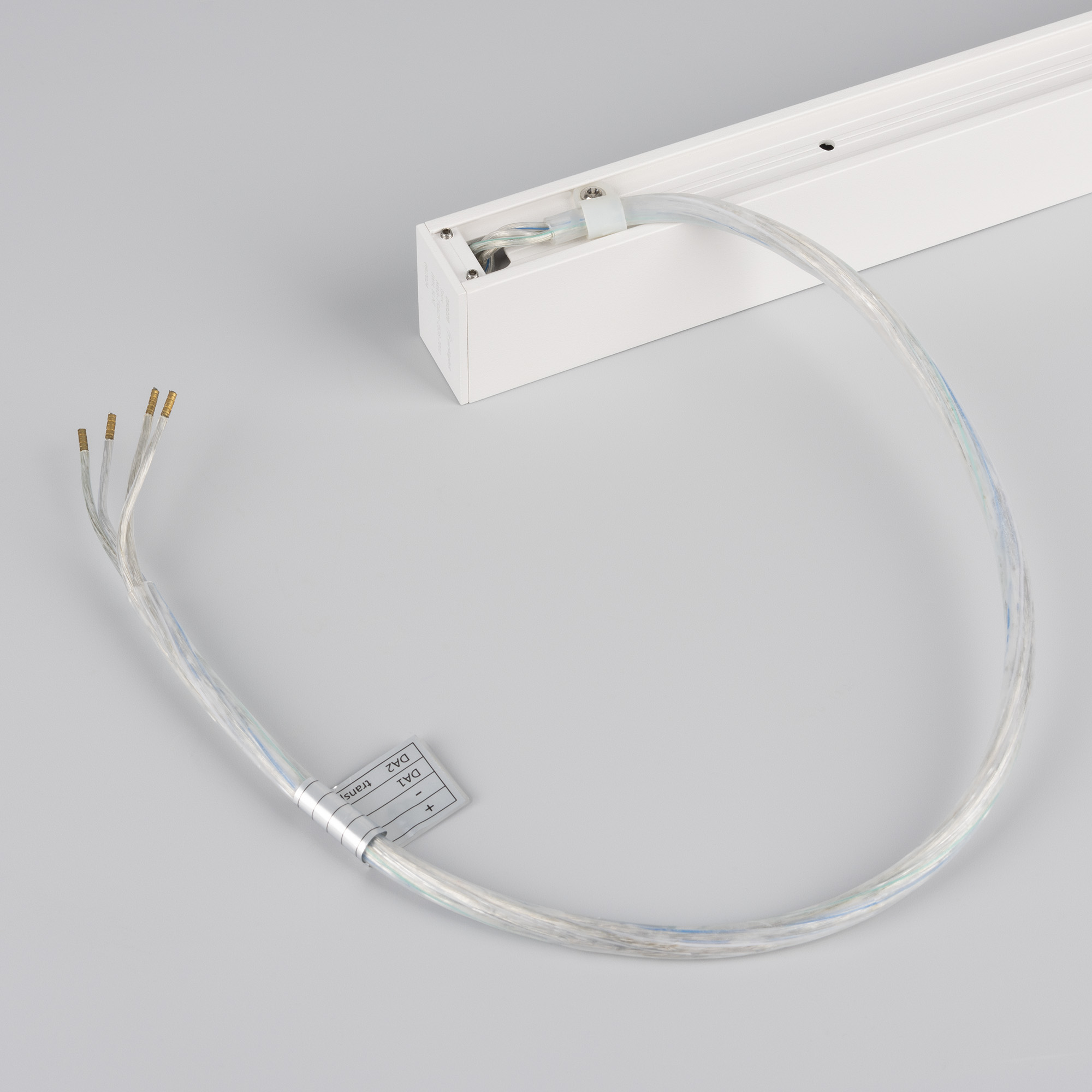 Подвесной, накладной магнитный трек, длина 2000 мм. DC24V, позволяет диммировать светильники по протоколу DALI. Материал алюминий, цвет белый. Две заглушки в комплекте. Размер ДxШxВ: 2003x25x38 мм. Размер (с учетом заглушек). Аксессуары для подвесного монтажа в комплект не входят. К плате идет провод 24В длиной 1м.