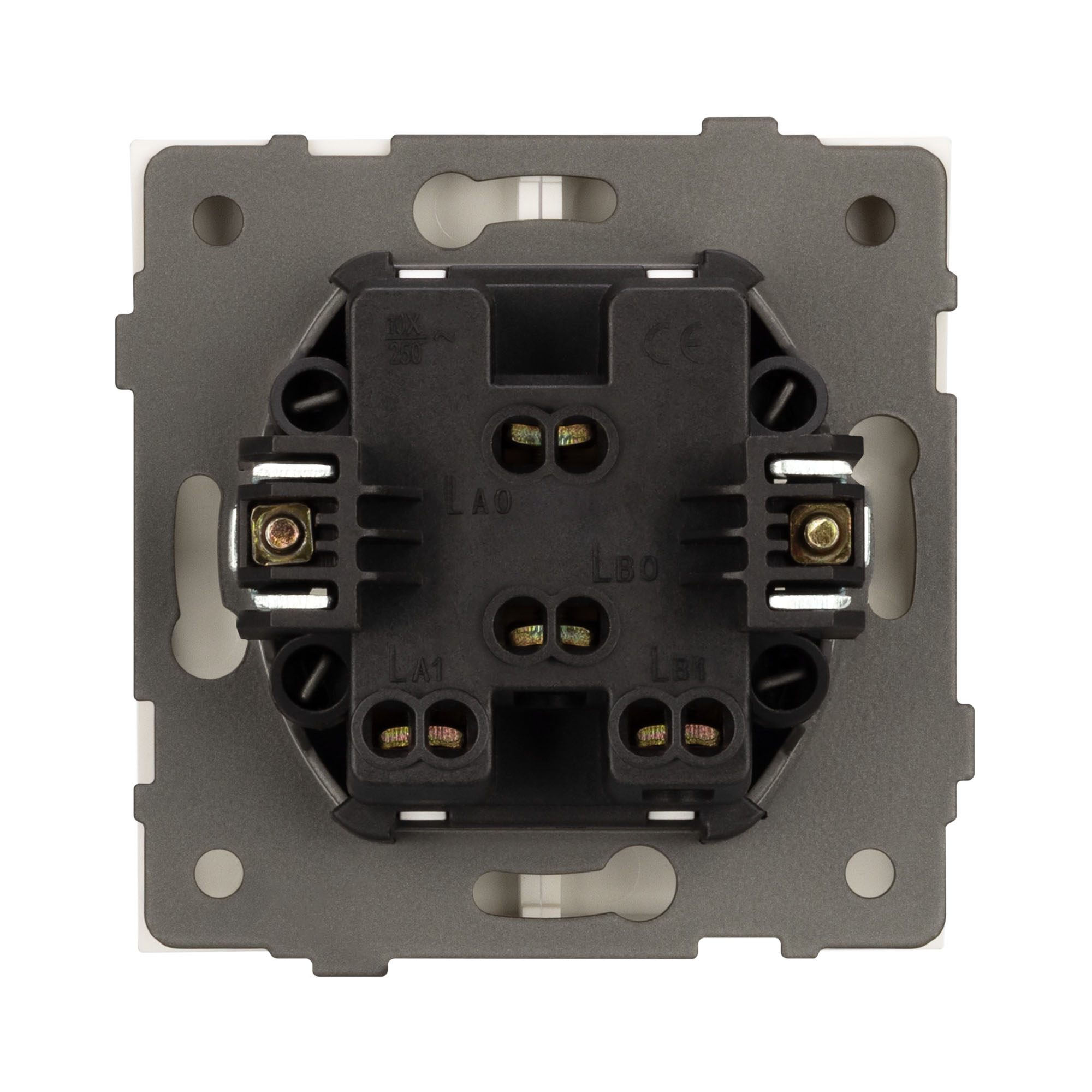 Механизм выключателя света клавишный на 1 пост 2 клавиши (непроходной). Цвет - белый. Без фронтальной рамки. Уровень пылевлагозащиты IP20. Выключатель устанавливается в стандартный круглый подрозетник круглого сечения диаметром 60мм.