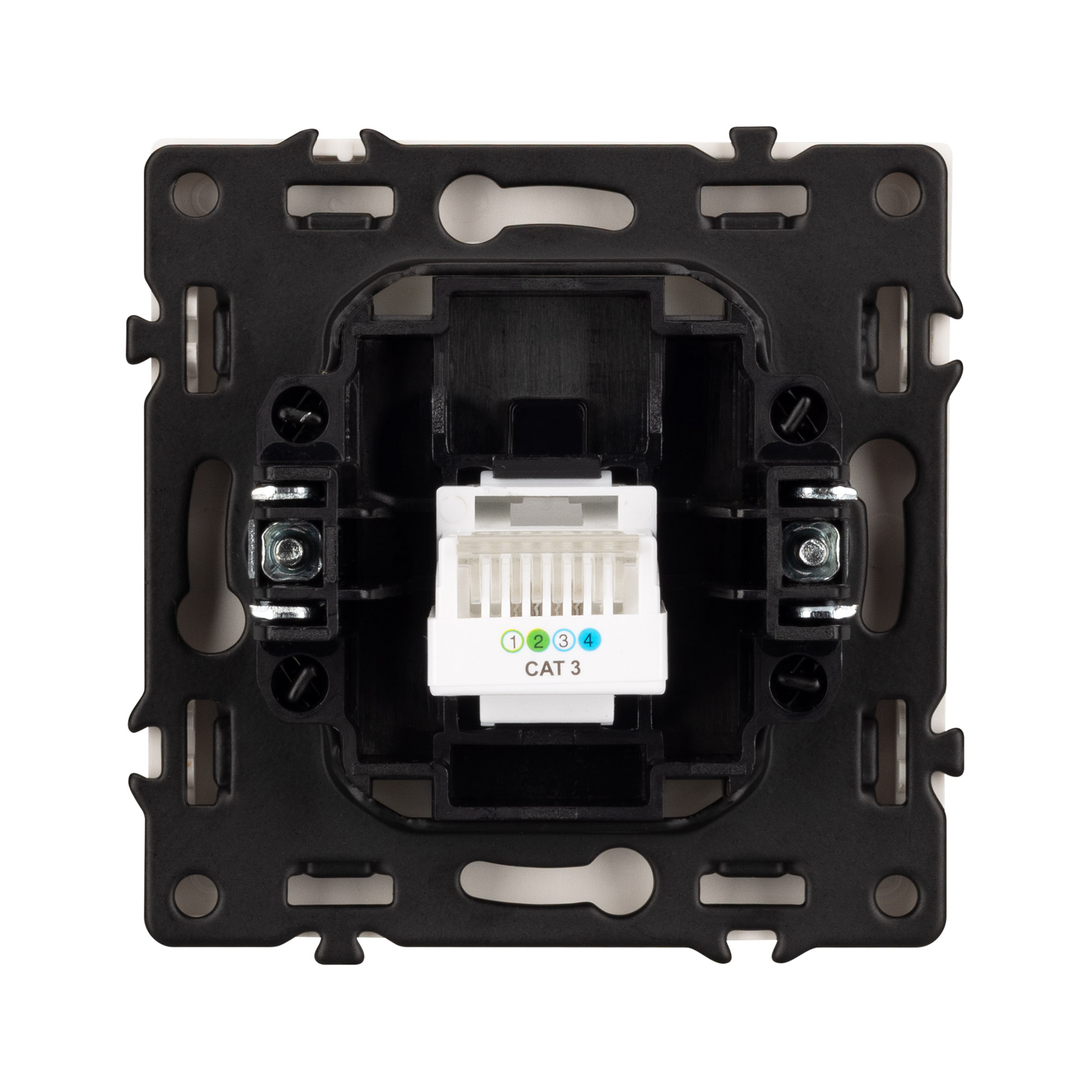 Выходной порт RJ-11 (Female) формата 6P4C соответствует категории 3 (Cat.3). Самозакрывающаяся крышка защищает выходной порт от повреждения и загрязнения внешних контактов разъема. Контактная часть выполнена по технологии IPC (изоляционно–пробивающего контакта) с нанесением цветной маркировки схемы разводки на корпус, позволяя быстро и легко подсоединить механизм компьютерной розетки к большинству многожильных кабелей типа UTP (неэкранированные). А усиленные распорные лапки двойного захвата надежно фиксируют механизм в установочном подрозетнике круглого сечения диаметром 60мм.