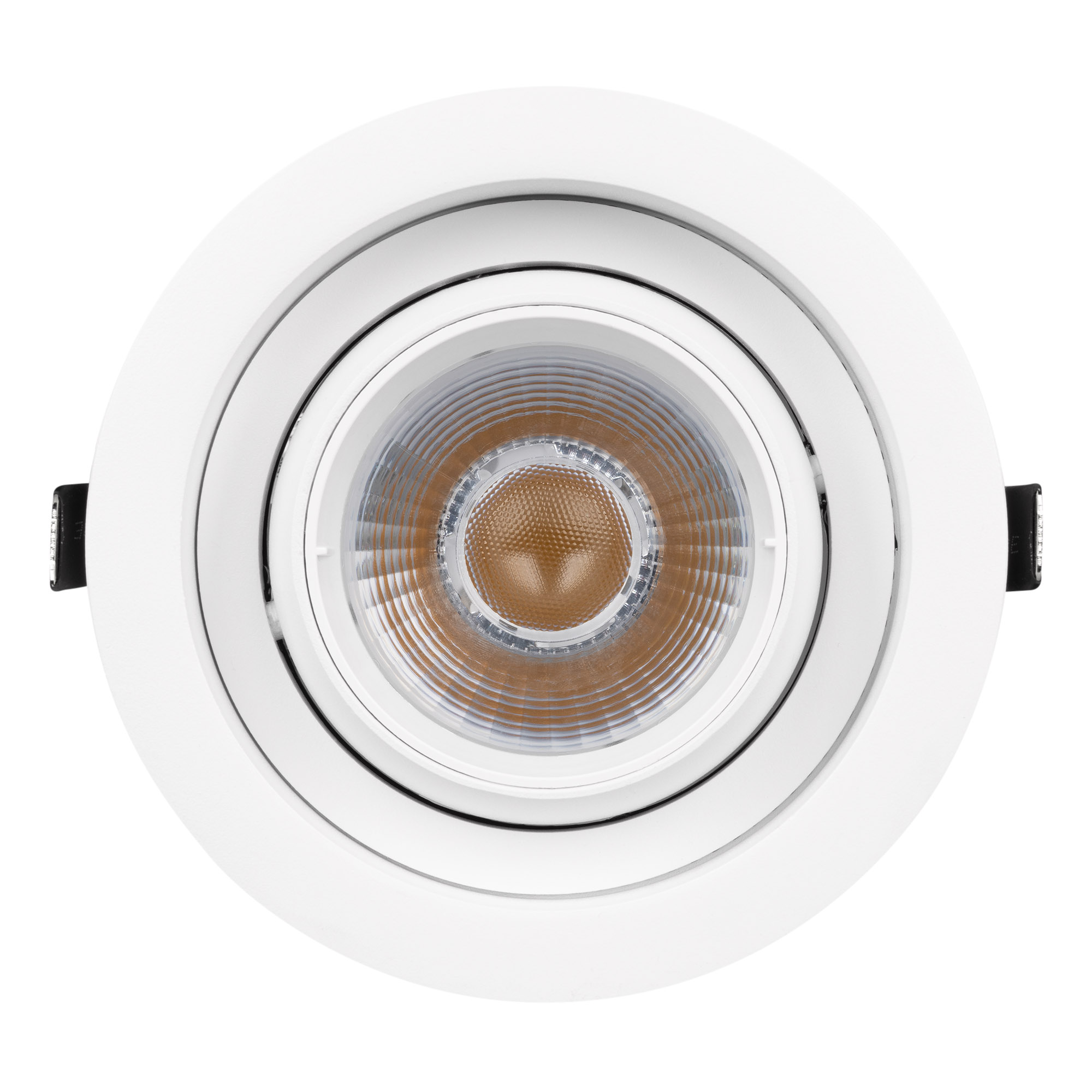 Встраиваемый карданный светильник. Мощность 30 Вт, св. поток 3260 лм, 108 лм/Вт, дневной 4000 K, CRI>92, угол 30°, напряжение питания 230 В. Белый корпус из алюминия, белая вставка, степень защиты IP20. Размер: диаметр 135 мм, высота 125 мм. Монтаж встраиваемый, установочное отверстие: диаметр 120 мм. Драйвер 24-42 В, 750 мА, пульсация <2%.