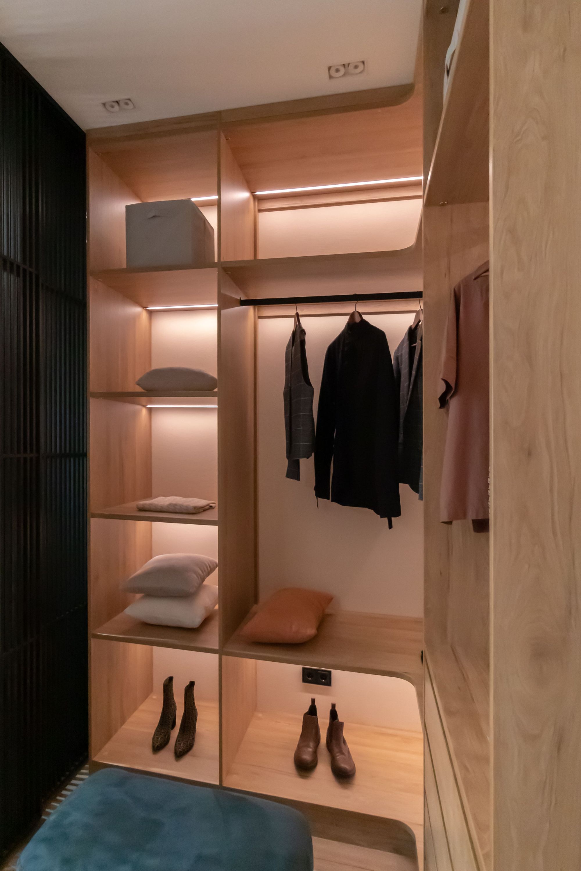 Если необходимо создать камерную обстановку, то вместо потолочных светильников у жильцов квартиры есть еще одна альтернатива — магнитная система. Треки миниатюрной магнитной трековой системы MAG 25 образуют углы и привносят в пространство геометрическую строгость. Вместе с тем широкое разнообразие магнитных светильников MAG 25 позволяет выбрать светильники разной формы. В спальне линии треков переходят с потолка на стены: благодаря этому решению стало возможно использовать магнитные светильники-споты MAG SPOT 25 в качестве бра.