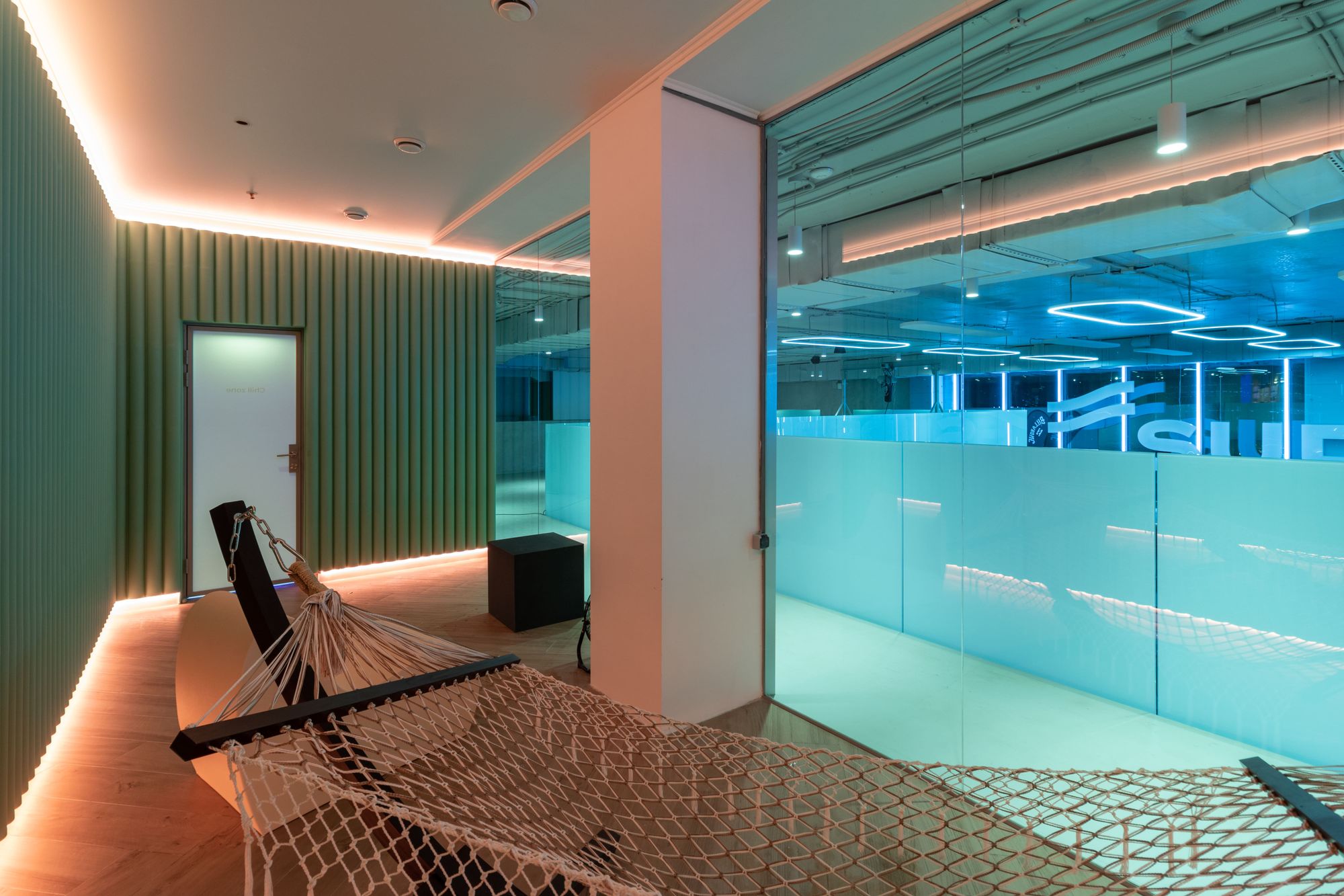 Подвесные светильники из дугового профиля управляются по протоколу DALI и DMX512 с возможностью реализации динамического освещения под фоновую музыку. В серфинг-центре предусмотрены датчики движения в проходных зонах и аварийное освещение.