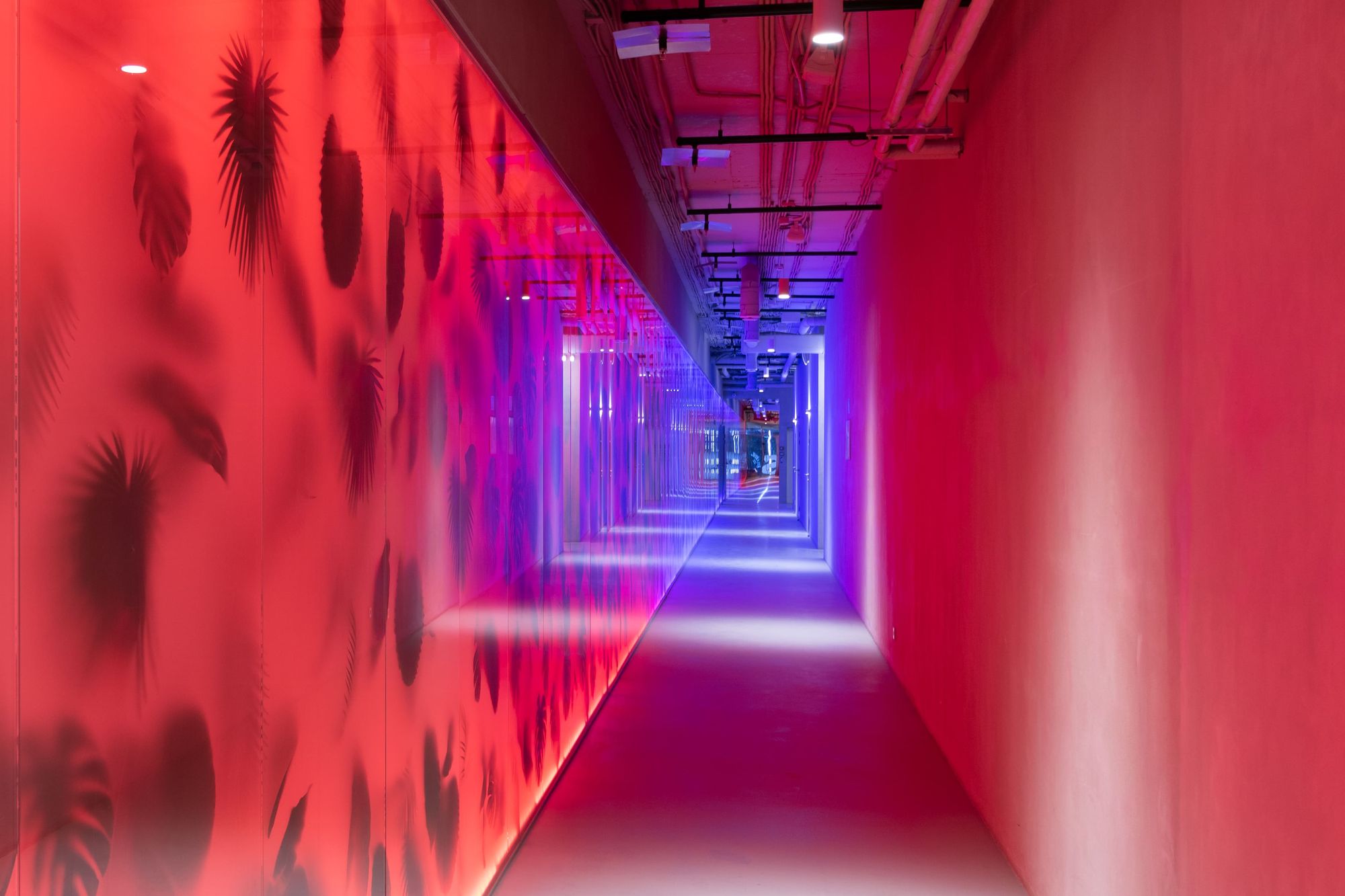 Ручное управление группами светильников, автоматическая смена сцен освещения в течение дня и общее управление всеми источниками света осуществляется с помощью планшета на стойке администратора. В офисном помещении, фитнес-зале и зоне отдыха сделано более спокойное нейтральнее освещение при помощи лент белого свечения.