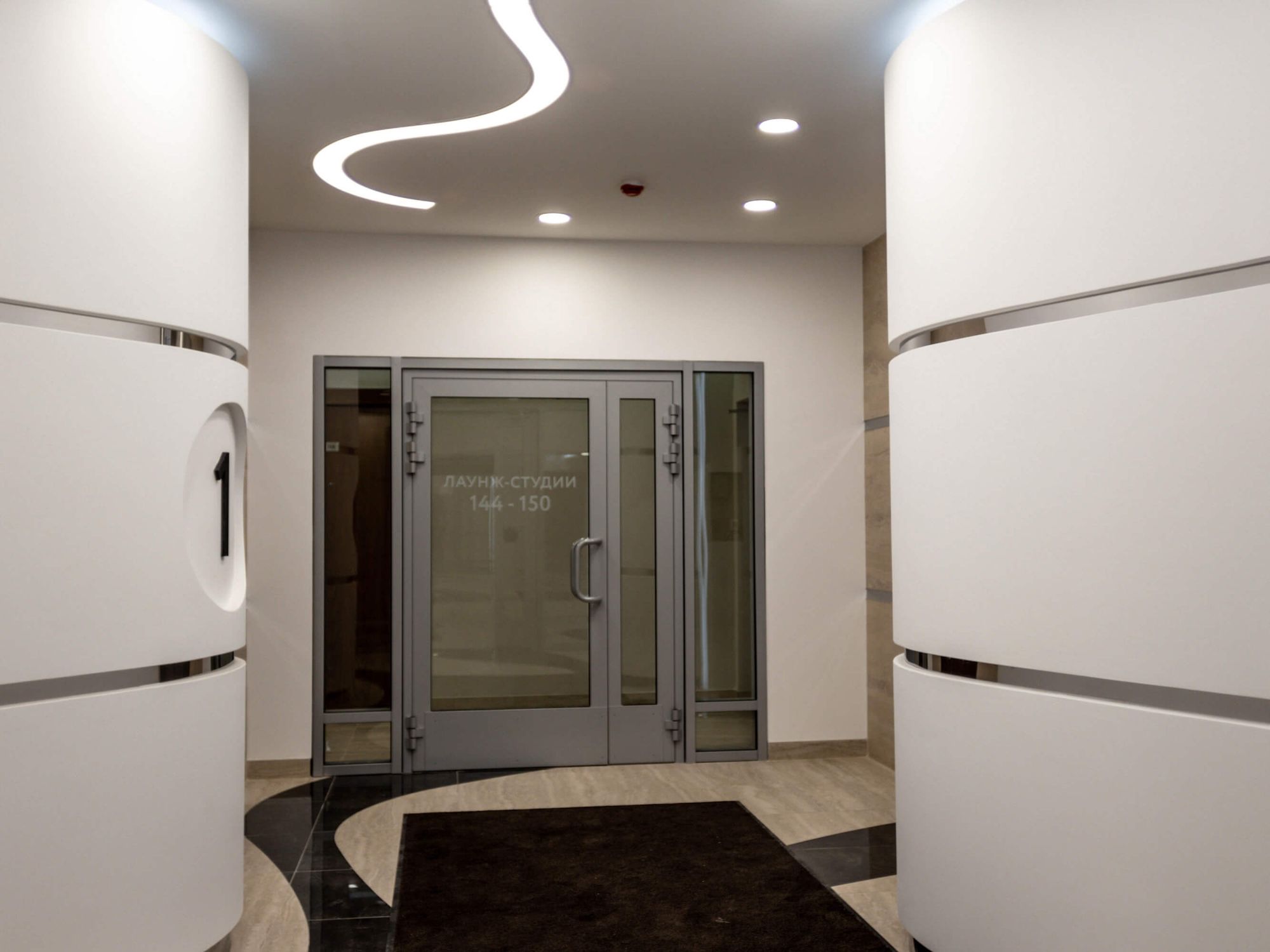 В лаконичных интерьерах лаунж-студий аккуратно и стильно смотрятся накладные круглые и подвесные линейные светильники. Они не только обеспечивают хороший уровень освещенности, но и выглядят как оригинальный элемент интерьера. Для подсветки потолка использована светодиодная лента, которая проходит по его границе плавными изгибами и добавляет пространству интересных световых деталей.