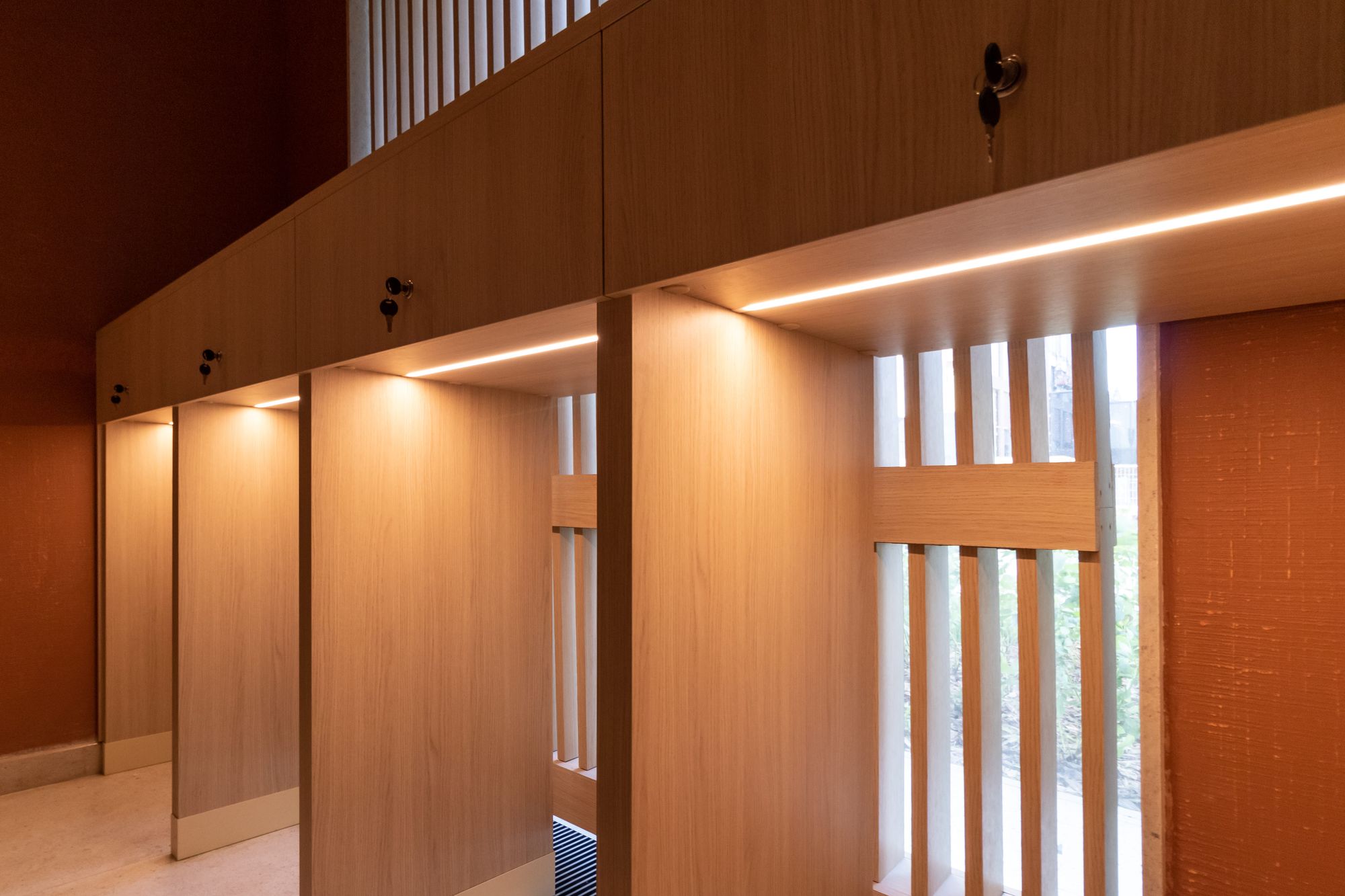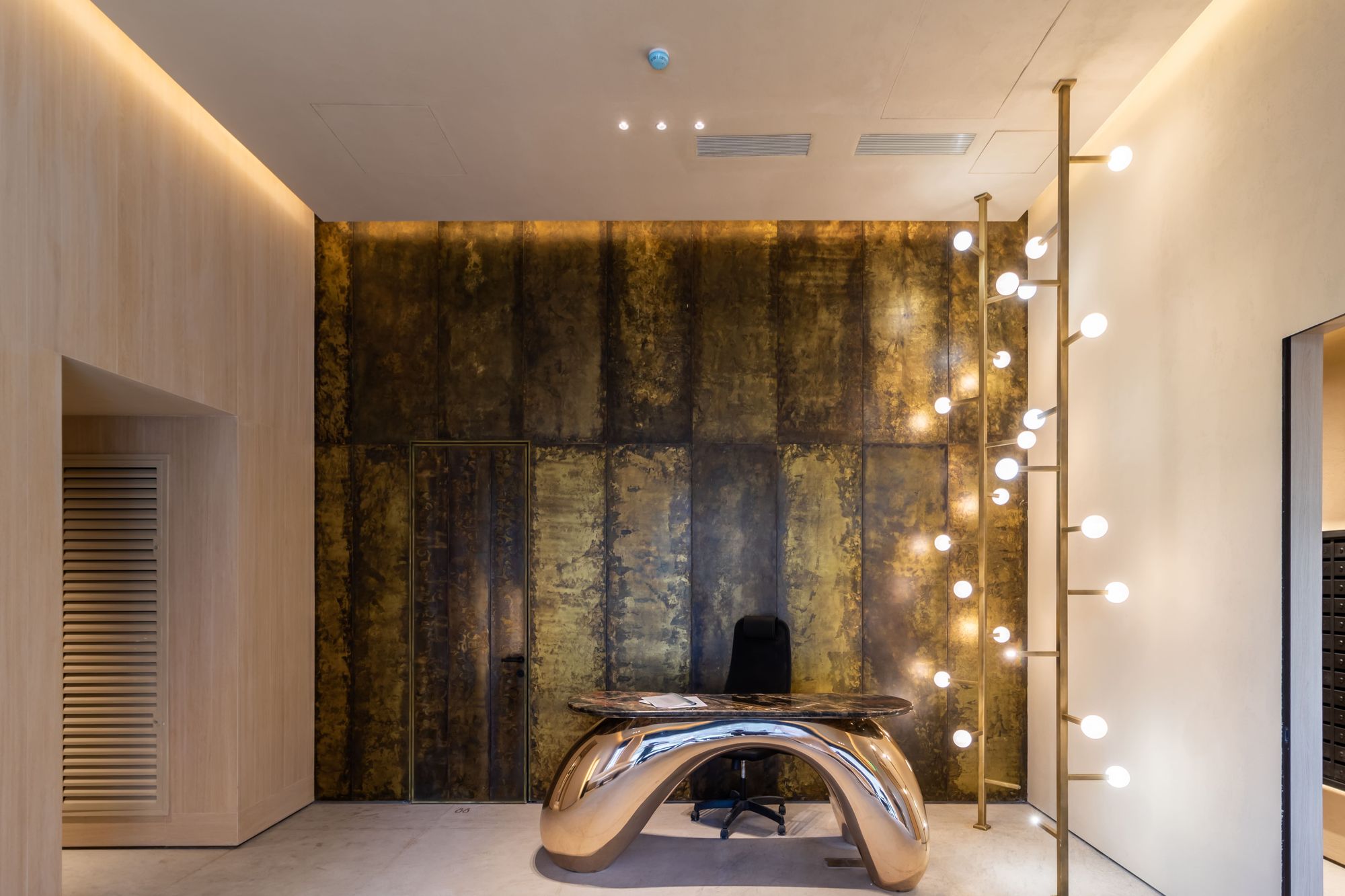 Природная концепция продолжается и внутри зданий. Жителей и гостей комплекса встречает просторное лобби в благородных осенних оттенках. Цветовую гамму помещения усиливают источники света с теплым белым свечением, создавая в лобби уютную и респектабельную атмосферу. Закарнизная подсветка на основе светодиодной ленты и профиля Arlight образует эффект парящего потолка, а также подчеркивает оконные рамы и зону почтовых ящиков. Встраиваемые даунлайты ATLAS, обладающие низким показателем дискомфорта (UGR<16) и небольшим углом излучения (35°), создают ненавязчивый комфортный свет.